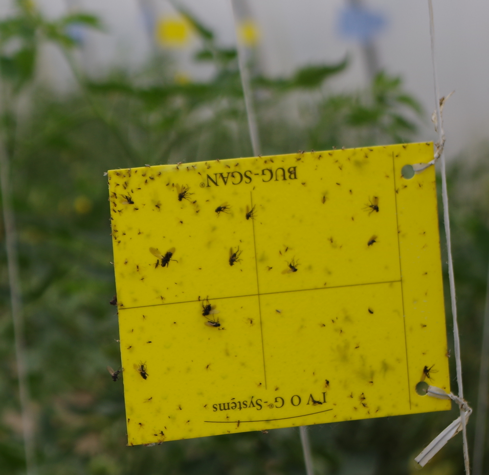 - Mettre en place dans les serres des plaques de couleurs engluées (photo 3) pour attraper les mouches des légumes ou les thrips suivant la couleur bleue ou jaune du panneau ; en extérieur, pour d’autres mouches comme la drosophile suzukii, nous plaçons des bols piégeurs avec un mélange liquide vinaigrée,