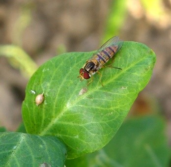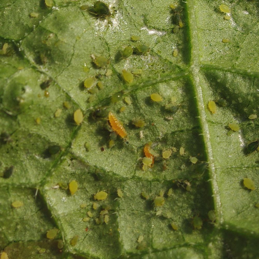 Pour les pucerons, nous observons la présence d’auxiliaires, les coccinelles (photo 2), les chrysopes, les syrphes (photo 1) les aphelinus (guêpe parasite) ou les cécidomyies (photo 3), … Et nous contrôlons les migrations saisonnières des pucerons ce qui nous permet souvent de ne pas intervenir.